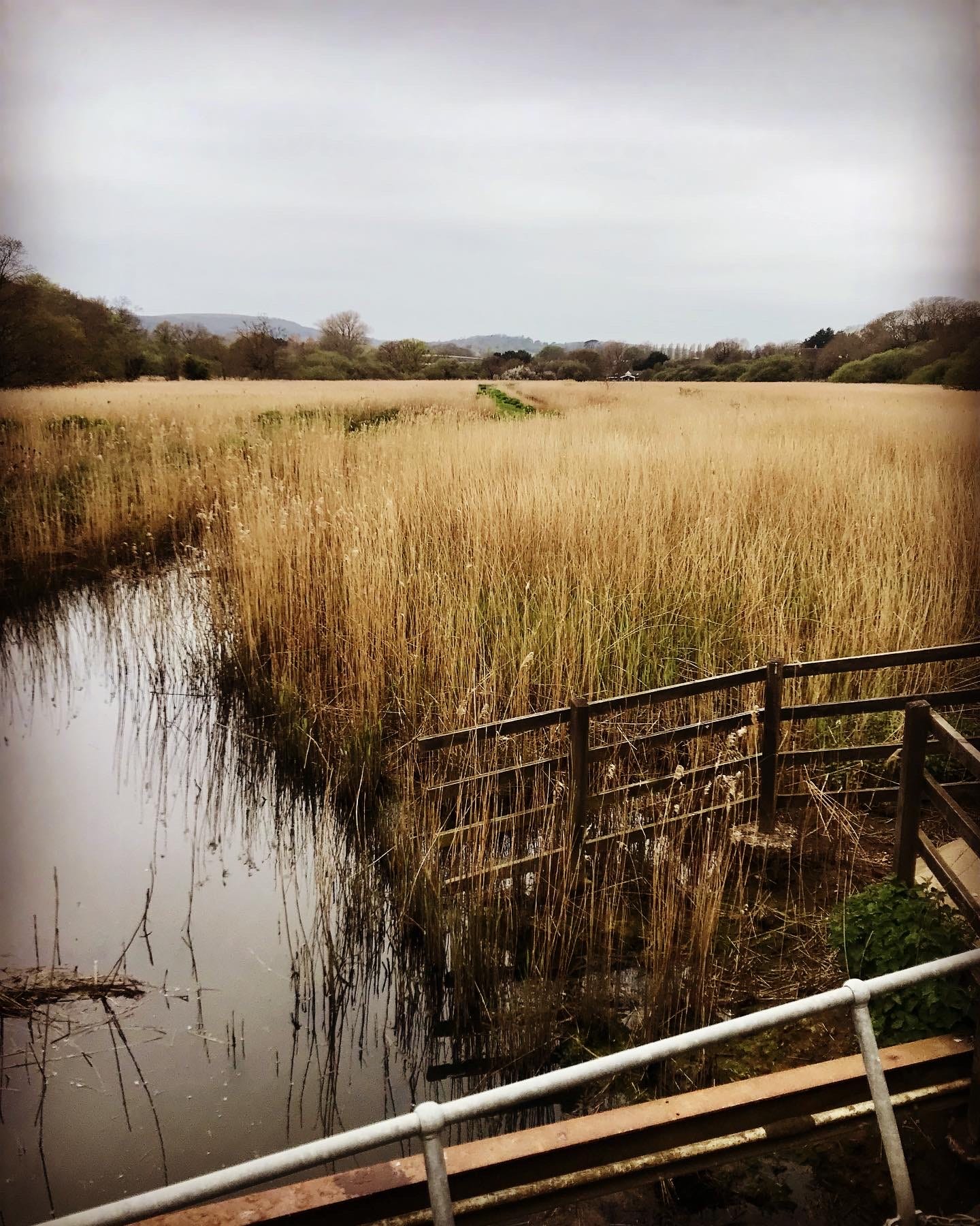 Prompt : Design a pattern for a crescent shaped shawl to be knitted in DK merino silk blend wool. You should include an interesting stitch. The design inspiration is a riverside reed bed.